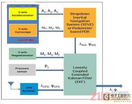 此外,由于MEMS壓力傳感器能夠測量相對于海平面的絕對氣壓。因此,它可以確定手機用戶在海平面以下600m到海平面以上 9000m之間的高度,輔助GPS的高度測量[2]。利用MEMS傳感器與GPS接收器的行人航位推算系統結構圖如圖2所示。