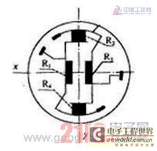 硅壓阻式壓力傳感器是采用高精密半導體電阻應變片組成惠斯頓電橋作為力電變換測量電路的,具有較高的測量精度、較低的功耗和極低的成本。硅壓阻式壓力傳感器其應變片電橋的光刻版本如圖2。