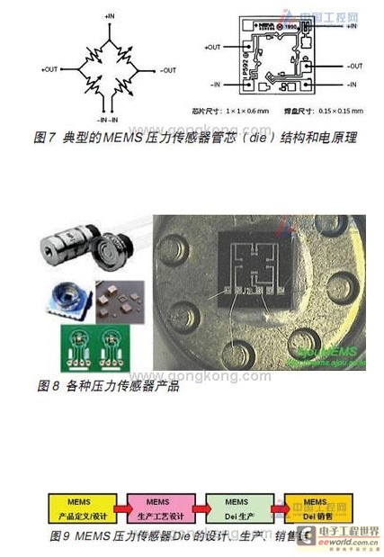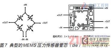 典型的MEMS壓力傳感器管芯(die)結構和電原理如圖7所示,左是電原理圖,即由電阻應變片組成的惠斯頓電橋,右為管芯內部結構圖。典型的MEMS壓力傳感器管芯可以用來生產各種壓力傳感器產品,如圖[FS:PAGE]8所示。MEMS壓力傳感器管芯可以與儀表放大器和ADC管芯封裝在一個封裝內(MCM),使產品設計師很容易使用這個高度集成的產品設計最終產品。