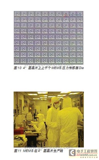 與傳統IC行業注重二維靜止的電路設計不同,MEMS以理論力學為基礎,結合電路知識設計三維動態產品。對于在微米尺度進行機械設計會更多地依靠經驗,設計開發工具(Ansys)也與傳統IC(如EDA)不同。MEMS加工除了使用大量傳統的IC工藝,還需要一些特殊工藝,如雙面刻蝕,雙面光刻等。MEMS比較傳統IC,工藝簡單,光刻步驟少,MEMS生產的一些非標準的特殊工藝,工藝參數需要按照產品的要求來進行調整。由于需要產品設計、工藝設計和生產三方面的密切配合,IDM的模式要優于Fabless+Foundry的模式。MEMS對封裝技術的要求很高。傳統半導體廠商的4〃生產線正面臨淘汰,即使用來生產LDO,其利潤也非常低,但是,如果生產MEMS,則可獲得較高的利潤。4〃線上的每一個圓晶片可生產合格的MEMS壓力傳感器Die5-6K個,每個出售后,可獲成本7-10倍的毛利(如圖10)。轉產MEMS對廠家的工藝要求改動不大,新增輔助設備有限,投資少、效益高。MEMS芯片與IC芯片整合封裝是集成電路技術發展的新趨勢,也是傳統IC廠商的新機遇。圖11是MEMS在4〃圓晶片生產線上。