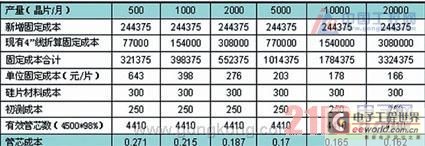 4”圓晶片生產線生產MEMS壓力傳感器成本估計如表所示,新增固定成本是指為該項目投入的人員成本和新設備的折舊(人員:專家1名+MEMS設計師2名+工程師4名+工藝師5名+技工12名,年成本147萬元,新增設備投入650萬元,按90%四年折舊計算);現[FS:PAGE]有4”線成本是指在5次光刻條件下使用4”線的成本(包括人工、化劑、水電、備件等的均攤成本);硅片材料成本是指雙拋4寸硅片的價格。