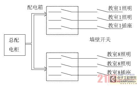 高校教學樓為長廊類設計,教室在長廊一側或兩側,配電為照明與插座分別由不同空開控制。同一側教室自然采光和燈光布局基本相同,一般每個教室采用兩個照明回路,分別給兩組燈光供電,每組燈由一個空開控制,并在教室內有墻壁開關控制。