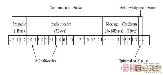 每個位置可以搭載2bit 的信息, 在50Hz 的電力線上,1s 可以傳輸200bit 的數據。因為采用電脈沖通訊,PLCBUS 信號可以傳遞得很遠。如圖2 所示。