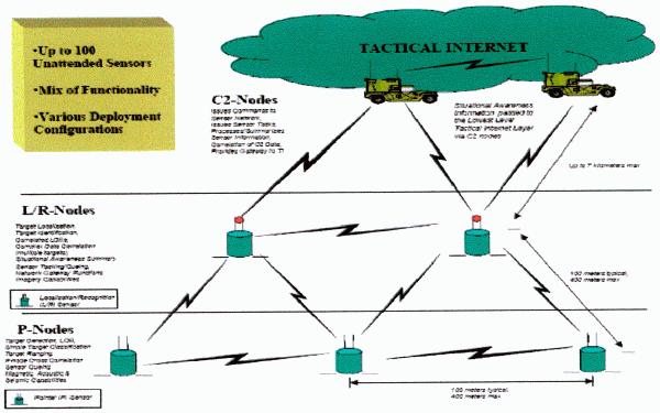 美國軍方研究的用于軍事偵查的NSOF(Networked Sensors for the Objective Force)系統[4]是美國軍方目前研究的[FS:PAGE]未來戰斗系統的一部分,能夠收集偵查區域的情報信息并將此信息及時地傳送給戰術互聯網。系統由大約100個靜態傳感器和用于接入戰術互聯網的指揮控制節點C2(command and control)構成,系統架構如圖2所示。