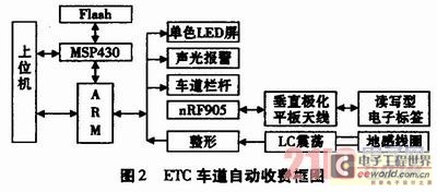 封閉式網絡環境下ETC系統按車型和行駛里程收費,收費系統對進入高速公路的每一輛車的車型進行識別并判斷類型,確認其進出口地址,按征收費率計算費額并完成收費。從ETC的工作流程分析可知一個較為完整的ETC車道所需的各個組成部分,由此可設計如圖2所示的ETC車道自動收費系統框圖。下位機有MSP430+ARM組成,通過與上網機連接,把數據信號傳輸到上位機,這樣就進行整個ETC系統分布式網絡化布局,ARM系統主要完成控制,MSP430單片機則主要負責車輛繳費信息的顯示,采用RFID技術,通過路側天線與車載射頻標簽之間的無線通信,在不需要司機停車和其他收費人員采取任何操作的情況下,自動完成收費處理全過程。