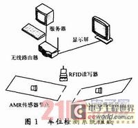 車位檢測系統組成如圖1所示,系統由服務器、無線路由器、車位顯示屏、RFID讀寫器和AMR(Anisotropic Magneto Resistive)傳感器節點組成。服務器負責對上傳的數據進行處理,將處理結果發送到顯示屏,擔負著向讀寫器發送指令的任務。無線路由器是整個車位檢測系統的重要部分,它負責將整個系統的各個部分組建成一個局域網。車位顯示屏用于車位現狀實時顯示。RFID讀寫器接收AMR傳感器節點上傳的數據,通過WiFi傳給服務器,也接收服務器的指令轉發到AMR傳[FS:PAGE]感器節點。AMR傳感器節點負責檢測車位上的磁場情況,根據磁場的變化情況判斷是否存在車輛,把檢測到的情況通過數據來反映,把數據打包通過無線方式傳給RFID讀寫器,節點和RFID讀寫器通信是雙向的。