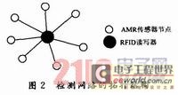 在系統設計時,系統網絡結構為星形拓撲結構,系統RFID讀寫器為網絡控制器,AMR傳感器節點均為從節點,網絡拓撲結構如圖2所示。 RFID讀寫器具有收發功能,負責系統的上下行數據或者指令的管理與控制;AMR傳感器節點負責磁場參數數據采集和數據預處理。