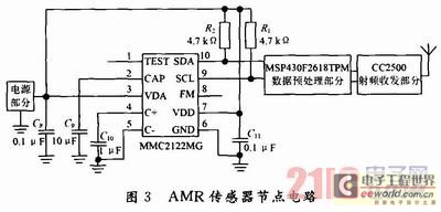 AMR傳感器節點基本電路如圖3所示。電源部分由TI公司的APL5312-33起到LDU功能,電源輸入電壓為4.2 V,輸出為3.3 V。