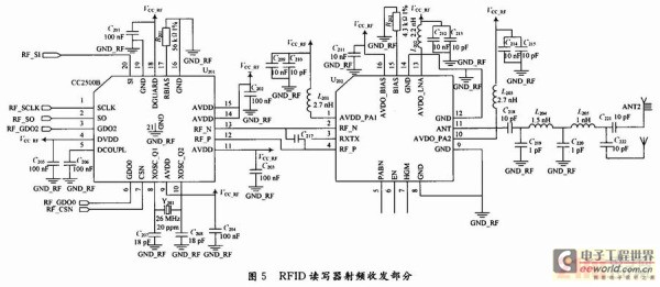 RFID讀寫器射頻收發部分電路如圖5所示,CC2500通過SPI與讀寫器控制部分進行通信,CC2591通過提供一個功率發送器增加鏈路預算,以改善輸出功率;CC2591具有低噪聲系數的低噪聲放大器(LNA)以改善接收機靈敏度,還具有功率放大器(PA)、開關射頻匹配器和巴倫電路,能滿足高性能無線應用的簡單設計。