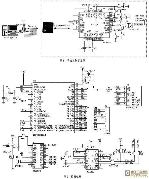 控制單元采用業界低功耗應用比較成熟的TI公司生產的MSP430系列,該系列是TI1996年開始推向市場的一種16位超低功耗的混合信號處理器(Mired Signal Proessor),其針對實際應用需求把許多模擬電路、數字電路和微處理器集成在一個芯片上,提供“單片”解決方案。在WIS系統中OBU和BSS中工作原理相同,所以重點介紹OBU部分設計,其控制部分原理圖如圖2所示。