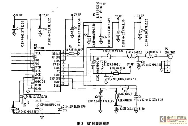 射頻部分采用TI公司CC1020作為射頻控制單元,該芯片為業界首例真正的單芯片窄帶超高頻收發器,有FSK/GFSK/OOK 3種調制方式,最小通道間隔為50 kHz,可滿足多通道窄帶應用(402~470 MHz以及804~94O MHz頻帶)的嚴格要求,多個工作頻段可自由切換,工作電壓2.3~3.6 V,非常適合集成擴展到移動設備作為無線數傳或電子標簽使用。該芯片遵從EN300 220.ARIB STD-T67以及FCC CFR47 part15規范。