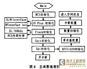 程序采用模塊化設計,用C語言編寫。主要由4部分在組成:主程序模塊、通信程序模塊、外圍電路處理模塊、中斷和存儲模塊。主程序主要完成控制單元的初始化、各種參數的配置及各外圍模塊配置和初始化等;通信程序模塊主要處理對RF芯片的配置以及433 MHz收發處理;外圍電路處理模塊主要對系統外部LED指示、電壓檢測、聲音提示以按鍵及其他處理;中斷和存儲模塊主要處理系統中斷和記錄存儲。主程序流程如圖4所示。