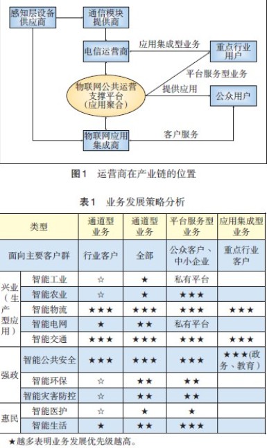 表1列出了運營商物聯網業務發展的重點,可以看出運營商應加強興業、惠民類型的物聯網應用,此類應用標準化程度高,用戶基數大,較易形成合理的商業模式,實現規模化應用;需在公共服務領域重點發力,致力做智能管道的提供者和通用支撐平臺的運營者;另外,應緊跟政府步伐,在農業、災害防控等領域積極探索新的融資模式,比如爭取政府補貼等。