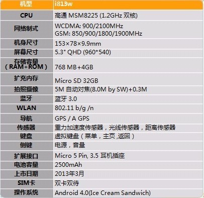 PHICOMM智能手機 i813采用高通雙核配置,支持WCDMA、GSM雙重制式,屏幕尺寸為5.3*QHD超大屏幕,電池容量2500mAh,采用Andriod4.0操作系統,雙卡雙待,加之精致的外觀設計,相信您一定會喜歡它!