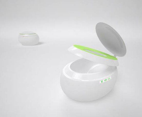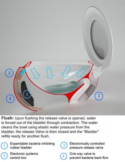 考慮到以上情況,設計師 David Hashimoto打破傳統設計了一款新型氣囊式馬桶Element。其外形圓潤,真的就像一顆大膠囊。馬桶內置彈性氣囊系統,通過產品示意圖可以看到,加壓過的水從馬桶邊涌向中心。通過這種完全不同于依靠水重力的沖水原理,Element馬桶利用更少的水量,實現相同的沖洗力。