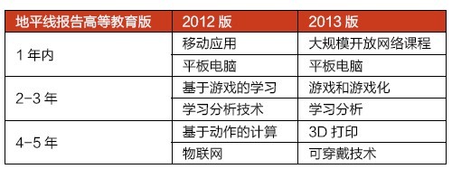地平線報告的每個版本都會對未來五年內在教育中將會用到的技術類型進行預測。2012年和2013年的高等教育版本中對技術類型的預測見表1。