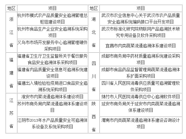 據《政府采購信息報》記者不完全統計,自今年年初至9月底,全國各地約有產品質量安全追溯體系建設項目57個。其中陜西省延安市商務局關于延安市肉類蔬菜流通追溯體系建設項目、貴陽市商務局關于貴陽市肉類蔬菜流通追溯體系建設系統集成項目、福建省經濟貿易委員會關于福建省"放心肉"服務體系肉品質量安全信息可追溯系統建設項目的采購額均高達上千萬元。