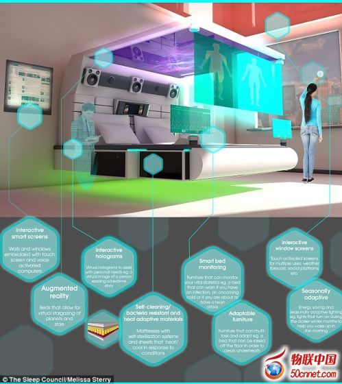 據國外媒體28日報道,倫敦設計師梅利莎-斯特里設計了面向未來的臥室,臥室內的智能床能夠監視主人的健康狀況,床墊可以自行清潔,床單采用的材料可以在主人睡覺時根據其體溫自行調節溫度。此外,未來臥室還為用戶準備了一個全息同伴,采用達西先生等名人形象,為用戶講睡前故事,幫助他們進入夢鄉。