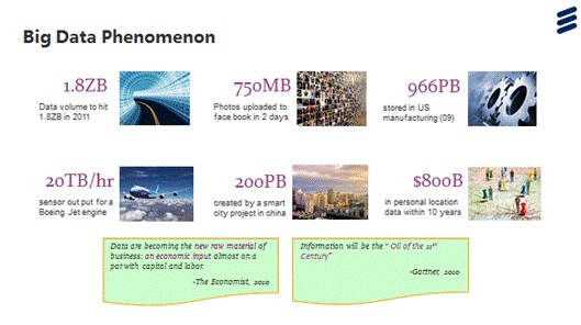 全世界每天都有幾十億人使用計算機、平板電腦、手機和其它數字設備產生海量數據。據Forrester的最新研究顯示:在線或移動金融交易、社交媒體、GPS坐標等數據源每天要產生超過2.5X1018的所謂“大數據”。今后幾年,數據的增長速度將超越摩爾定律。