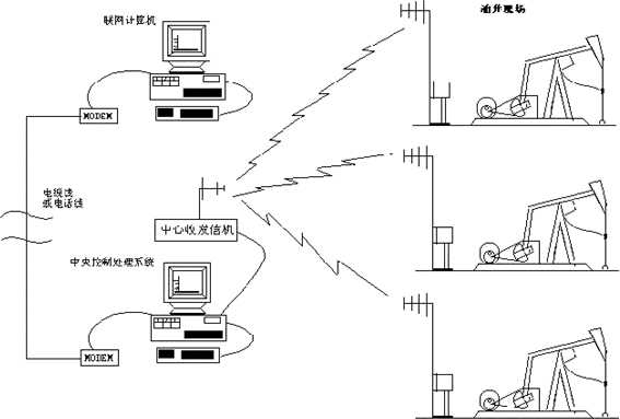 本系統結構如下圖所示,系統主要由采油場監控中心和油井無線遙測遙控主機、傳感器、電機控保裝置等組成。采油場監控中心一般設置在礦部、隊部或其它監控調度部門,包括有一臺計算機,一臺打印機和監控中心收發信機。