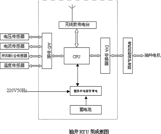 RTU由帶有A/D,D/A變換器的高性能的單片機,電源管理電路,蓄電池供電電路以及無線數傳電臺組成。A/D變換將傳感器送來的表示油井狀態的模擬信號變成數字信號,再由無線數傳電臺進行信號處理和調制,以射頻信號的形式幅射到空間。電源管理電路是用來監測交流電源用,一旦交流電源斷電,自動轉為畜電池供電。當交流供電正常時,又恢復由交流電源供電并對蓄電池充電,始終保持RTU供電正常。如下圖所示。