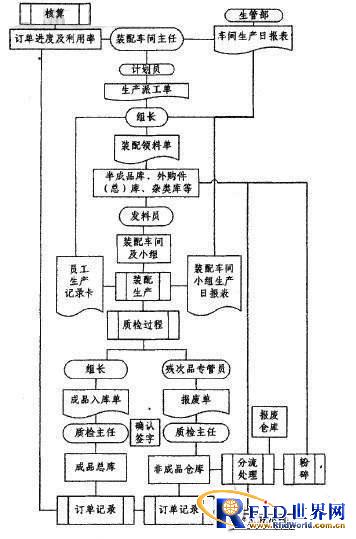 現有企業管(guan)理(li)系(xi)統中生(sheng)產(chan)(chan)過程(cheng)信息(xi)始(shi)終是“離線”的,質(zhi)量工(gong)藝(yi)、物料(liao)消耗、實際產(chan)(chan)量、殘次(ci)品數等(deng)生(sheng)產(chan)(chan)信息(xi)還是靠原始(shi)的人工(gong)錄入方式,不(bu)能(neng)連續、自(zi)動(dong)、完整地反映在企業管(guan)理(li)系(xi)統中。其流程(cheng)如圖2所示。裝配(pei)車間主任根據(ju)交期先后和(he)物料(liao)的齊(qi)備情(qing)況,交計劃員(yuan)電腦(nao)排(pai)產(chan)(chan),填“生(sheng)產(chan)(chan)派(pai)工(gong)單”將生(sheng)產(chan)(chan)任務下達(da)給各個小組長(chang)。組長(chang)依據(ju)“生(sheng)產(chan)(chan)派(pai)工(gong)單”填寫(xie)“領料(liao)清(qing)單”,并到發料(liao)倉庫領料(liao)。