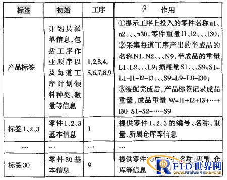 在生產(chan)線工(gong)位供(gong)貨環(huan)節中,生產(chan)物(wu)流部門將零(ling)部件送(song)達工(gong)位之后(hou),MES系(xi)統(tong)更新零(ling)部件數量信息及(ji)工(gong)序(xu)信息。完工(gong)后(hou),高頻讀(du)寫器讀(du)取(qu)產(chan)品標簽(qian),系(xi)統(tong)檢查(cha)產(chan)品經過的(de)(de)各道工(gong)序(xu)、料耗等(deng)裝(zhuang)配(pei)信息,并以生產(chan)料耗表(biao)的(de)(de)形(xing)式呈現給裝(zhuang)配(pei)車間主任(ren)、成本(ben)分析員(yuan)(yuan)、工(gong)資核算(suan)員(yuan)(yuan)。最后(hou),工(gong)作人員(yuan)(yuan)取(qu)下產(chan)品RFI標簽(qian),循(xun)環(huan)使(shi)用。圖5中。各標簽(qian)采集(ji)的(de)(de)數據如表(biao)2所示(shi)。