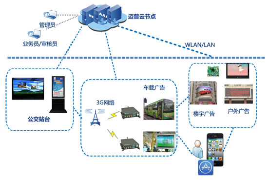 首先是公交云—站臺公交車輛位置顯示、車內上網、廣告的智能公交解決方案。邁普云服務在智能公交系統的應用,充分融合及發揮了邁普云在多媒體及定位方面的技術優勢,以及基礎通信系統設計方面的豐富經驗。在站臺查詢臨近公交動向,上車后還可實時接收到公交的到站信息等。在公交車內只需要放置一臺邁普設計的小型化車載3G終端, 通過此終端內置的以太口端口,WIFI 功能, 媒體播放等功能,配合云端服務,乘客即可使用手機、PAD、筆記本等設備與公交車載傳媒互動,將車載電視屏的內容傳送到手機上,并訪問車內的各種音視頻娛樂信息,下載更多實用A P P 與文件;甚至可以通過內置的社交功能,與其他乘客充分互動。公交傳媒公司及監管單位可輕松向公交及站臺推送多媒體信息或政府公告;公交- 站臺- 調度中心的顯示屏上可以基于地利位置的功能模塊進行多媒體信息交互和監控。在整個方案中,各類資訊、多媒體、廣告等能通過豐富的途徑到達乘客,實現良好的傳媒效果;乘客可以輕松享受互聯網絡,接收到豐富的信息,還能與系統實現多種互動;公交系統能更為便捷準確的實現管理功能,整體系統也為智能城市的建設提供了良好的補充,提升了城市形象。