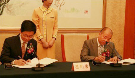張家口市宣化區人民政府區長王小軍(左)與李宗霖董事長簽訂了項目合作協議。