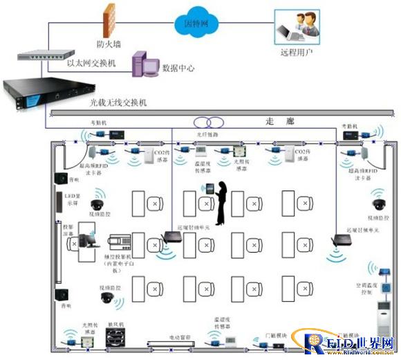 在教室前后門各安裝一個RFID考勤機,采用RFID標簽(校園一卡通)對學生進行考勤統計,對進入教室的人員進行身份識別,對合法用戶進行考勤統計,對非法用戶進行告警。同時可通過WiFi無線覆蓋,在遠程對考勤情況的監控,統計以及存檔打印等。