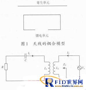 圖2中,寄生單元等效為左回路的L1,R,C,其中,R等效為輻射體的自電阻。而饋電單元等效為右回路,L2等效為饋電單元的自電感。由于饋電單元的自阻抗非常小,所以在等效電路中被忽略了。