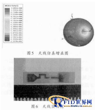 本文采用Ansoft公司的電磁仿真軟件HFSS 11.0對天線進行了仿真,天線結構如圖3所示。該天線結構分為矩形饋電環和變型彎折偶極子輻射體兩部分,芯片貼在矩形饋電環的開口處進行激勵,通過電感耦合將能量送至輻射體上。輻射體有兩個中間部分連接在一起的變型彎折偶極子構成。這兩個彎折偶極子的長度是有差異的,并不完全相等,通過統一饋電,可以形成兩個比較靠近的諧振頻率,從而拓展天線的帶寬。階梯狀彎折的偶極子可以縮短天線的整體長度,使得天線結構緊湊。