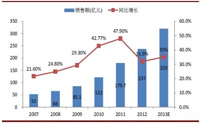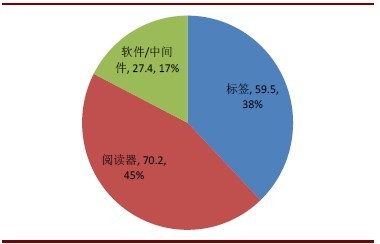 據工信部預計未來十年物聯網將實現大規模普及,2010年我國物聯網市場規模在1933億左右,增長60%,RFID市場規模120億元左右,2011年中國RFID產業的市場規模達到了179億元,比2010年增長了49%。2011年中國RFID產業鏈各環節如射頻芯片、標簽封裝產品與設備、軟件/中間件、系統集成都呈現出高速增長的勢頭,2013年中國RFID市場將繼續保持快速增長,預計比2012年增長35%左右,我國RFID產業市場規模將達320億元左右,此外工信部預計至2015年整個物聯網市場容量可達5000億左右。