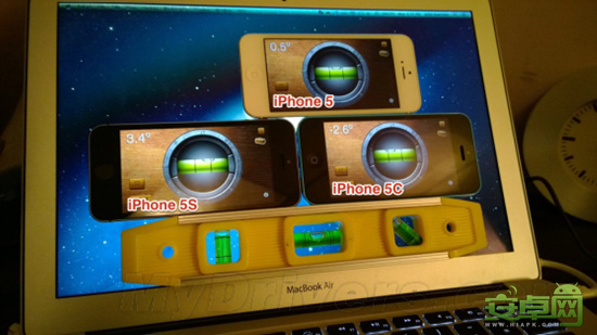 如圖所示,圖中用于測試的筆記本其實是位于水平面上的,但是 iPhone 5s 測試出來的角度是 3.4°,iPhone 5c 的測試結果是 -2.6°,最準確的可能要數 iPhone 5 了,為 0.5°,和平面并沒有很大的角度差距。