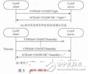 請求/響應模型:請求包含在可證實的或不可證實的信息中,如果服務器端是立即可用的,它對請求的應答包含在可證實的確認信息中來進行應答。圖5是基本的 GET請求和響應模式,其中圖5(a)表示成功發送請求和收到ACK確認信息,圖5(b)表示重傳了請求信息,然后才收到ACK確認信息。