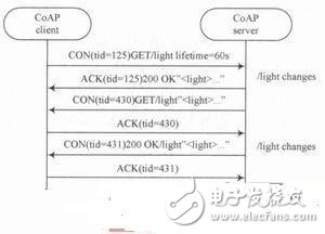 2.2 CoAP的訂閱機制HTTP的請求/響應機制是假設事務都是由客戶端發起的,通常叫做拉模型。這導致客戶端不能高效的知統中,設備都是無線低功耗的,這些設備大部分時間是休眠狀態,因此不能響應輪詢請求。而CoRE認為支持本地的推送模型是一個重要的需求,也就是由服務器初始化事務到客戶端。推送模型需要一個訂閱接口,用來請求響應關于特定資源的改變。而由于UDP的傳輸是異步的,所以不需要特殊的通知消息。訂閱機制如圖4所示。