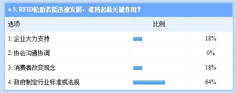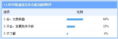 統計數據顯示,超過一半的人(64%)認為,RFID輪胎近幾年將成為發展趨勢;32%的人則持相反觀點,他們認為目前的發展條件還不夠;僅有4%的調查者表示“不了解”。RFID輪胎的“知名度”,由此可見一斑。