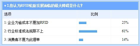 盡管如此,RFID輪胎在發展過程中仍面臨很多難題。調查結果顯示,61%的調查者認為,“行業標準或法規跟不上”是其發展面臨的最大障礙;25%的調查者認為,最大難題是“企業為省成本不愿加RFID”;另有14%的調查者則認為,“消費者不愿為此埋單”是最大障礙。