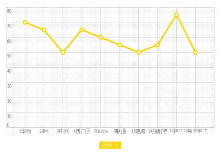 活躍力得分主要來自于品牌關鍵詞搜索,旨在評估以上品牌在大信息時代運用互聯網整合營銷、宣傳品牌的綜合能力。該項屬于相對得分,及搜索量為第一的品牌得分最高,以此類推。目前該項超過50分的品牌有10個(如圖1.3),分別是華為(70)、IBM(65)、中興通訊(50)、西門子(65)、Oracle(60)、中國聯通(55)、惠普(50)、施耐德(55)、銀江股份(75)與航天科工(50)。其中僅中國聯通、銀江股份與航天科工不屬于跨國公司,其表現值得肯定。