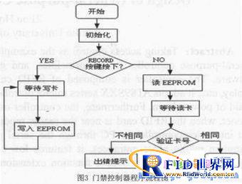 在正常工作狀態下,當有RFID卡靠近讀卡模塊時,RFID卡從讀卡模塊的天線獲得能量并開始工作,卡號以串行方式發送給單片機,單片機接收到卡號后,將其與預先寫入EEPROM的卡號進行比較,如果兩個卡號相同,視為卡號有效,則輸出開鎖信號,顯示器顯示“come in please!”;如果兩個卡號不相同,視為卡號無效,顯示器顯示“error!”。