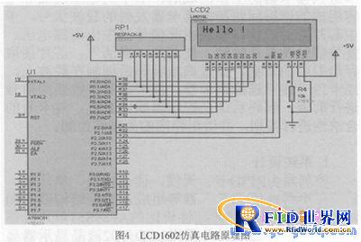LCD1602仿真電路原理圖如圖4所示。編寫一段LCD測試程序在1602的第1行顯示一個字符串“Hello!”用于測試LCD顯示是否正常,運行仿真后,液晶顯示器顯示“Hello!”,說明測試成功。