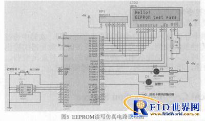 EEPROM讀寫仿真電路原理圖如圖5所示。編寫一個EEPROM測試程序,用于測試EEPROM讀寫功能是否正常,運行仿真后,液晶顯示器第1行顯示“Hello!”,第2行顯示“EEPROM test pass”說明測試成功。