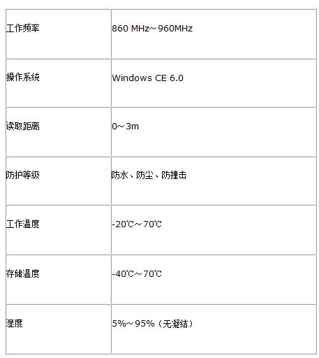 該系統采用的是無源超高頻RFID技術,其閱讀器主要技術指標為: