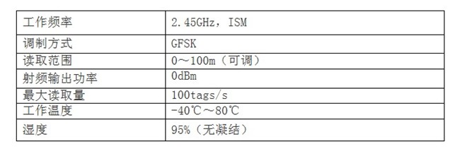該系統采用的是2.45G有源RFID技術,其閱讀器的主要技術指標為: