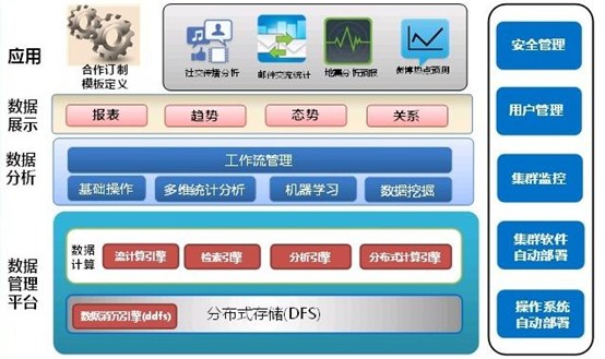 上圖可見,Scistor®BDMS賽思大數據管理系統架構分為四層。最底層為數據管理平臺,負責完成數據存儲與計算。其中ddfs采用的是賽思自主創新的高效數據消冗引擎,即賽思消冗技術。賽思消冗技術結合了定長分塊技術和變長分塊技術的優點,形成了文件感知消冗技術,一方面占用少量系統資源,另一方面達到很好的消冗效果;檢索引擎主要負責完成實時查詢與全文檢索,賽思檢索引擎支持多種檢索模式,一份數據既支持實時查詢,也支持離線分析,還支持全文檢索和MR并行計算;分析引擎主要負責數據離線分析;分布式計算引擎采用share-nothing架構,負責系統并行計算,實現并行計算編程模型和運行時框架,從而為數據分析層提供強大的計算能力。