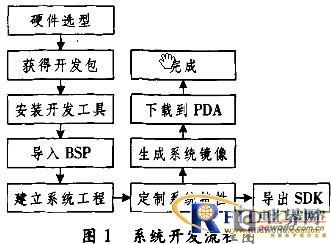 PDA常用的操作系統有WinCE和Linux。WinCE系統下的開發工具軟件主要有:C、C#、Java,Embedded Visual Basic和Embedded Visual C++等;而Linux系統下一般用C語言來進行開發。本文作者是在WinCE系統下進行軟件開發的。系統開發流程如圖1所示。