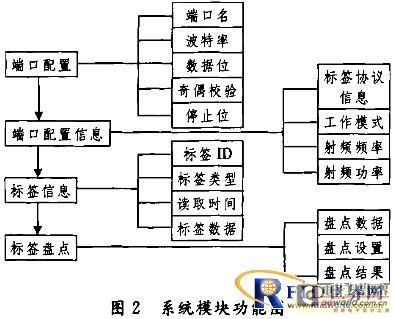 在PDA上開發RFID系統需要實現的功能模塊主要有4個:端口配置、端口配置信息、標簽信息和標簽盤點。系統模塊功能圖如圖2所示。