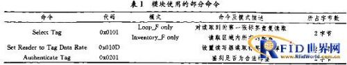 本文所使用的RFID讀寫模塊的部分命令如表1所示。