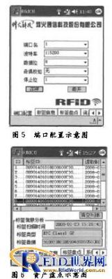 圖5和圖6所示為在WinCE系統下進行調試并實現RFID功能的圖示。圖5為端口配置示意圖。圖6為資產盤點示意圖,反映了掃描到的標簽相關信息,從而完成了在PDA上實現RFID識別和處理功能。此外還需要將PDA、RFID讀寫模塊及天線進行封裝,使其真正一體化。