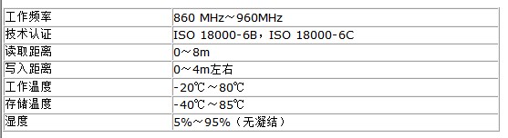 該系統采用的是無源超高頻RFID技術,其閱讀器的主要技術指標為: